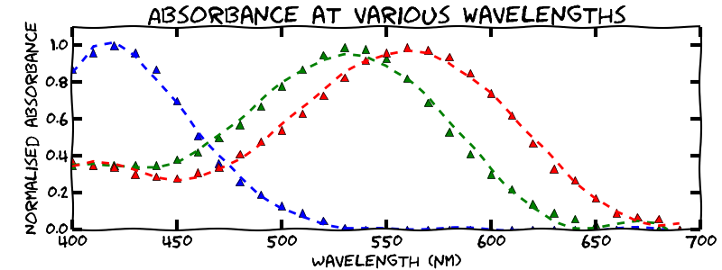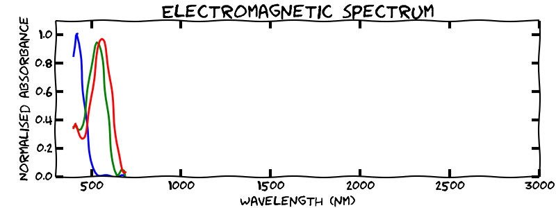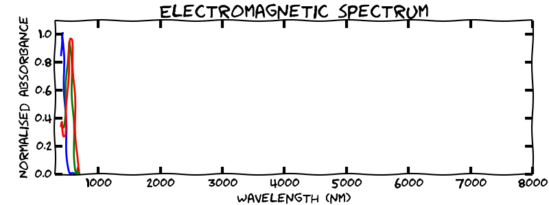 Humans can only see from about 350nm to 800nm. Here’s graph code I had laying around for some other stuff, which shows how the human eye’s photoreceptors respond to various wavelengths: