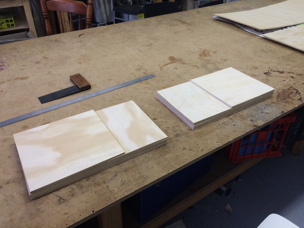 Laying out the wood panels after using the table saw. Then, laying them out again after remembering to actually tighten the table saw’s extensions so it cuts straight: