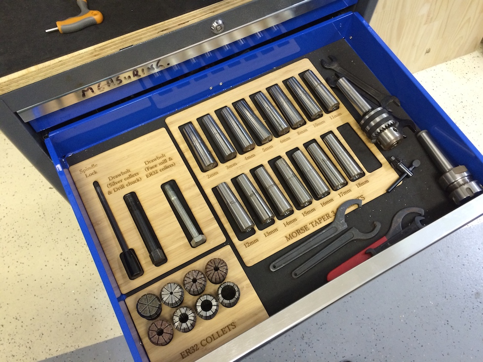 Any mill needs dozens of parts just to hold milling bits. A bit of lasercut organising later:
